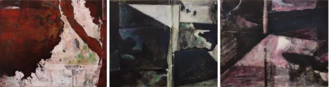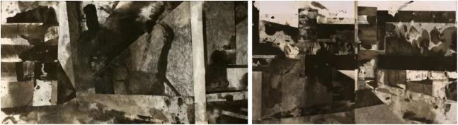 色調主要以黑白為主,以拼貼的方式體現,他創作的方式是用用墨染過的宣紙拼貼在畫布上的形式呈現的。這些宣紙是他創作的主要材質。