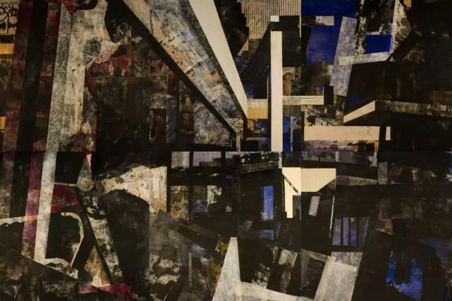 那么同理。在這幅畫中他正好用了這些元素來代表身邊無時無刻發生的事情,讓人有一種被淹沒的感覺。將這些紙剪碎再重新拼貼起來的過程,就好像是身邊發生的所有事情。雖然其實都有他自己的規律,但是在自己的視角中卻又是那么的無序。