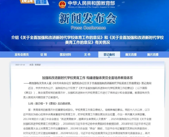 2020年教育部發布介紹了《關于全面加強和改進新時代學校美育工作的意見》,“美育”一詞瞬間登上熱搜引發熱議。