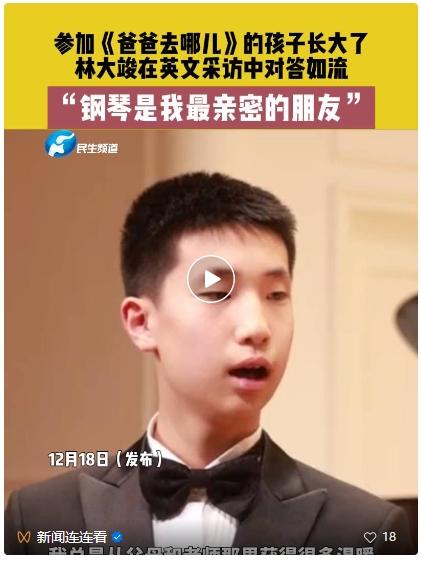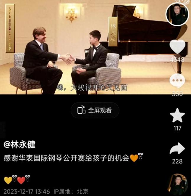 12月17日,演員林永健在個人社交平臺分享了一段兒子林大竣接受采訪的vlog,他還發文致謝:“感謝華表國際鋼琴公開賽給孩子的機會”。