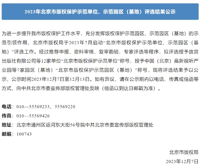 為進(jìn)一步提升版權(quán)保護(hù)工作水平,充分發(fā)揮版權(quán)保護(hù)示范園區(qū)、示范園區(qū)(基地)的示范引領(lǐng)作用,北京市版權(quán)局于2023年7月啟動(dòng)“北京市版權(quán)保護(hù)示范單位、示范園區(qū)(基地)”評(píng)選工作。