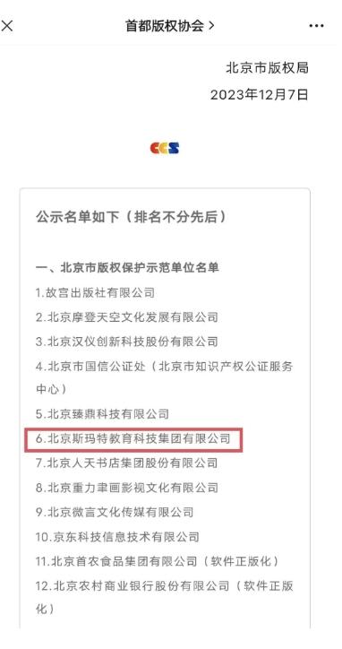 2023年5月,斯瑪特教育集團被北京市豐臺區市場監督管理局,北京市豐臺區知識產權局認定為斯瑪特知識產權指導站。